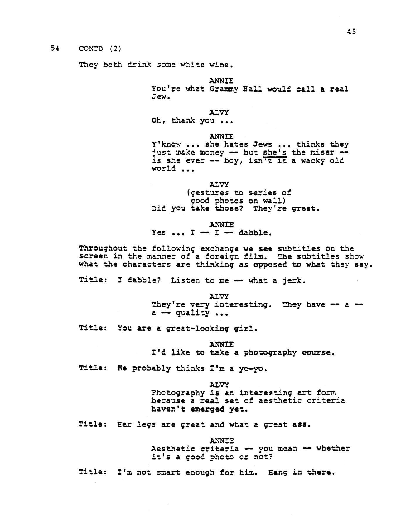 - Allen on writing Annie Hall: "I've always been able to get laughs. I wanted to move on. This is not a quantum leap, but at least it's a couple of inches in the right direction." The New York Times, 4/20/77