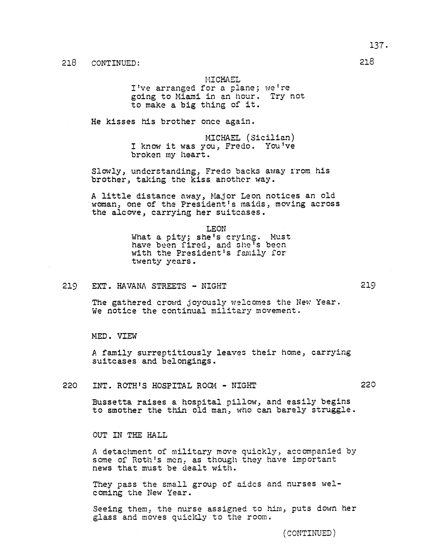 - In an early version of the script, an ongoing story line was Tom Hagen having an affair with Sonny Corleone's widow. This was later discarded, but the line where Michael Corleone tells Hagen that he can take his "wife, children and mistress to Las Vegas" was kept. IMDB